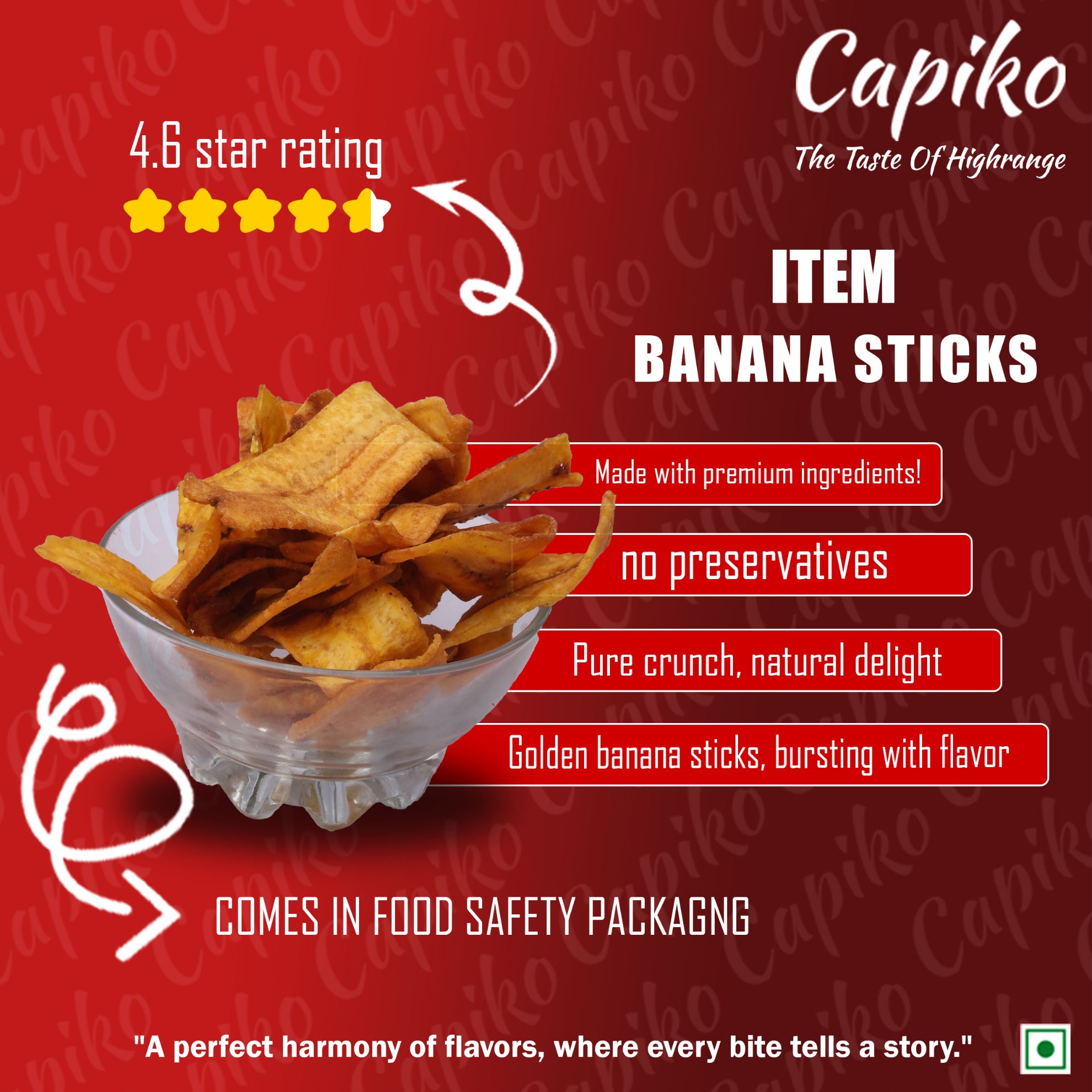 Banana Sticks- RipedDescription: Delight in the crispy sweetness of Capiko’s Ripe Banana Sticks. Thinly sliced and perfectly golden, they’re a unique and tasty snack for any time! Enjoy the natural goodness of ripe bananas.