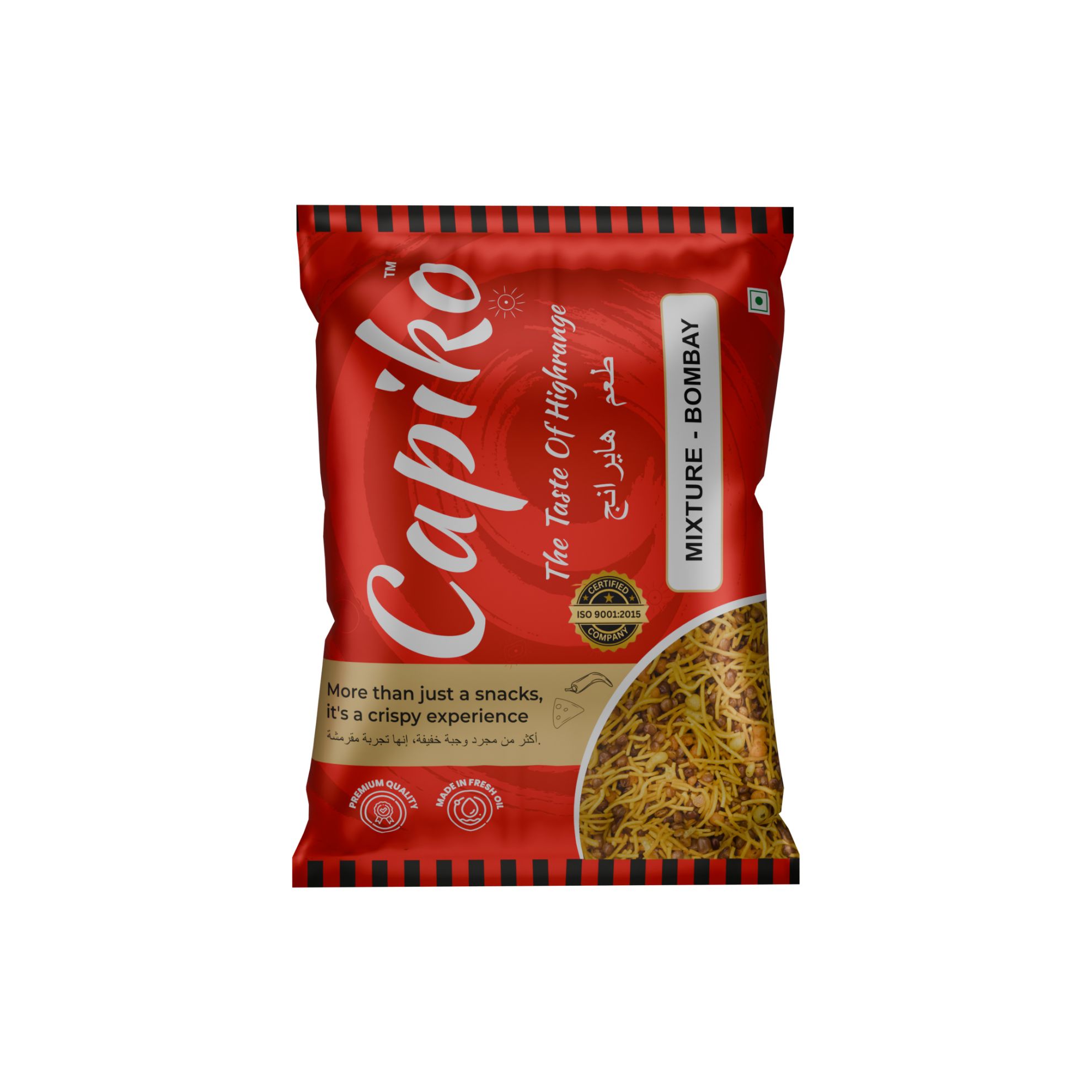 Description: Relish the bold and spicy flavors of Capiko’s Bombay Mixture, a classic snack packed with crunchy gram flour strands, peanuts, and an aromatic blend of spices.Ingredients: Gram flour, peanuts, fried curry leaves, rice flakes, oil, salt, and spices.