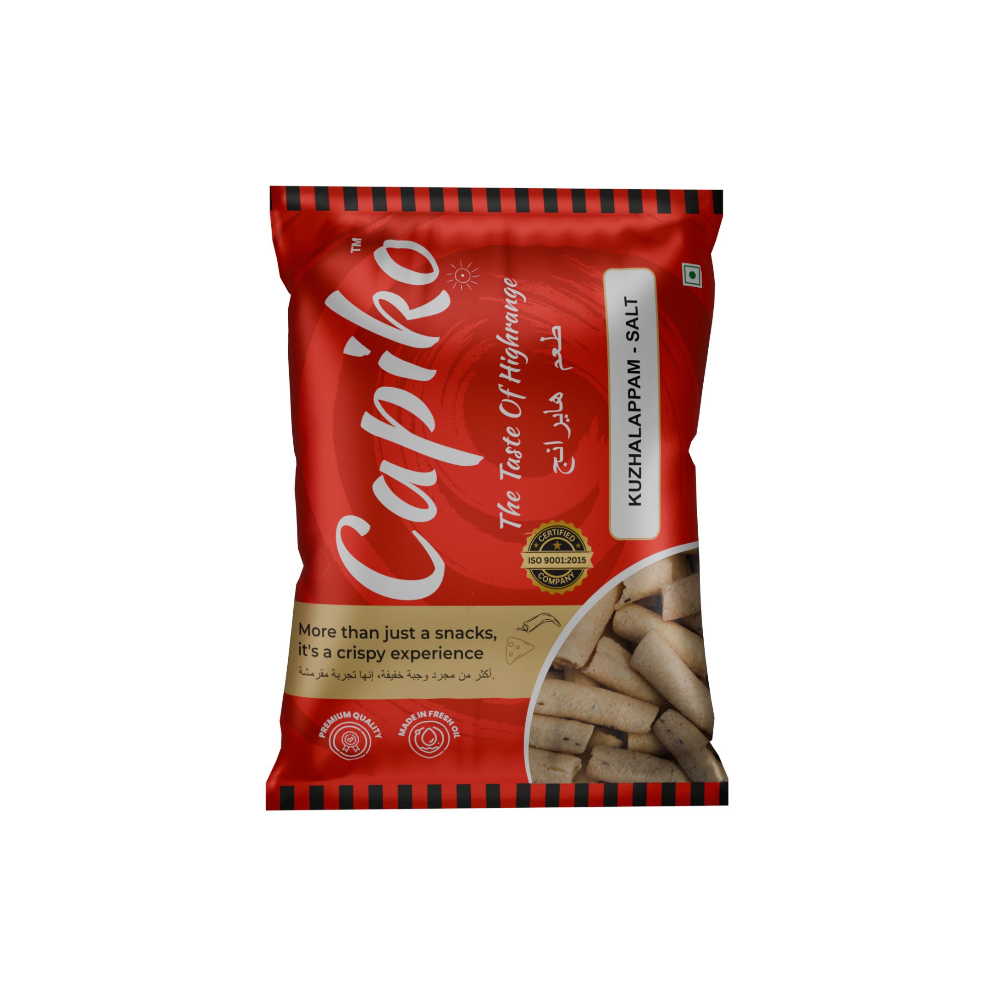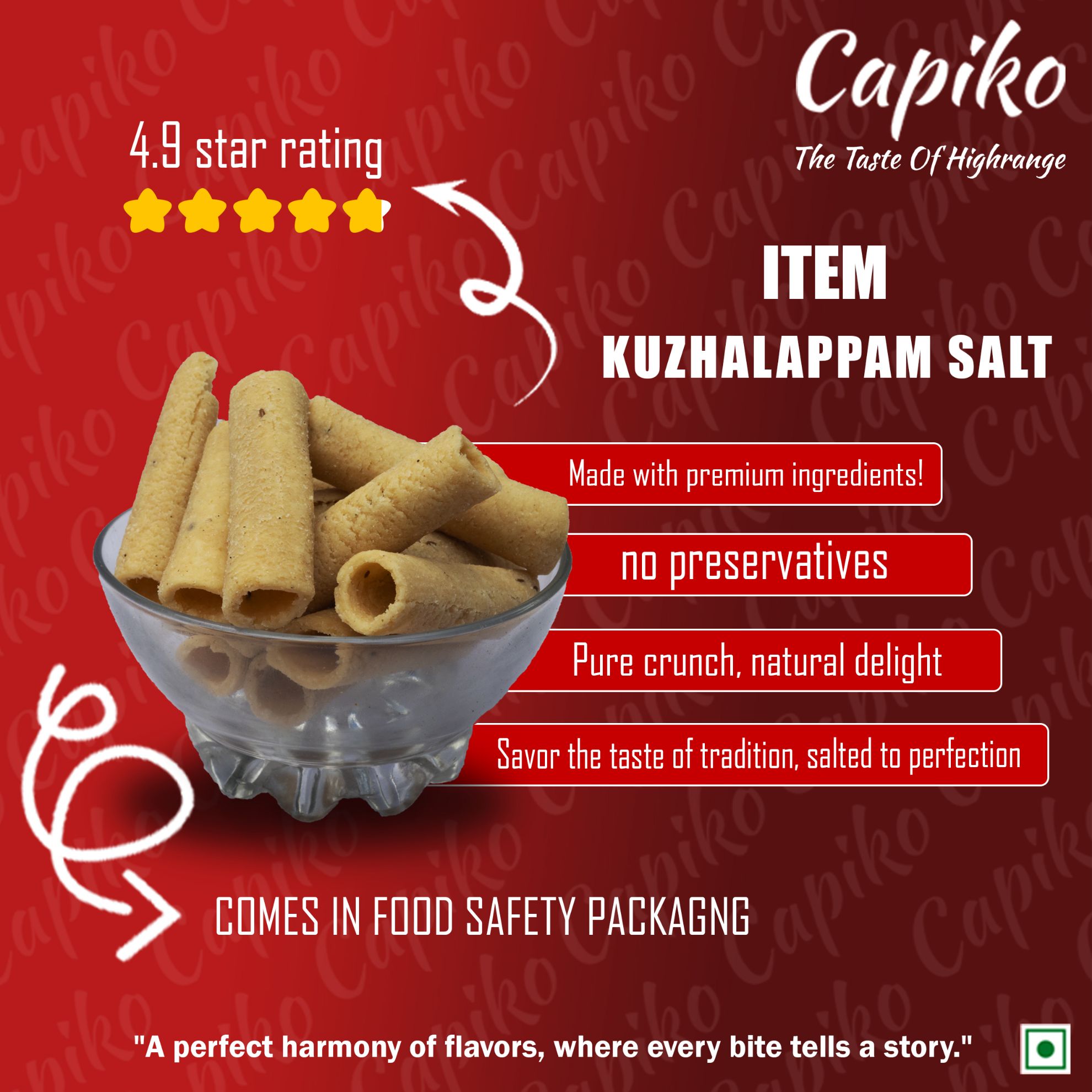 Kuzhalappam – saltDescription: Enjoy the crunchy and flavorful bite of Capiko’s Kuzhalappam, a traditional snack made with rice flour and seasoned with spices which you love. Perfect for a savory snack anytime!